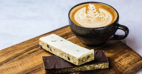 Baton proteic organic cu fulgi de ovaz, fructe de padure si glazura de iaurt.